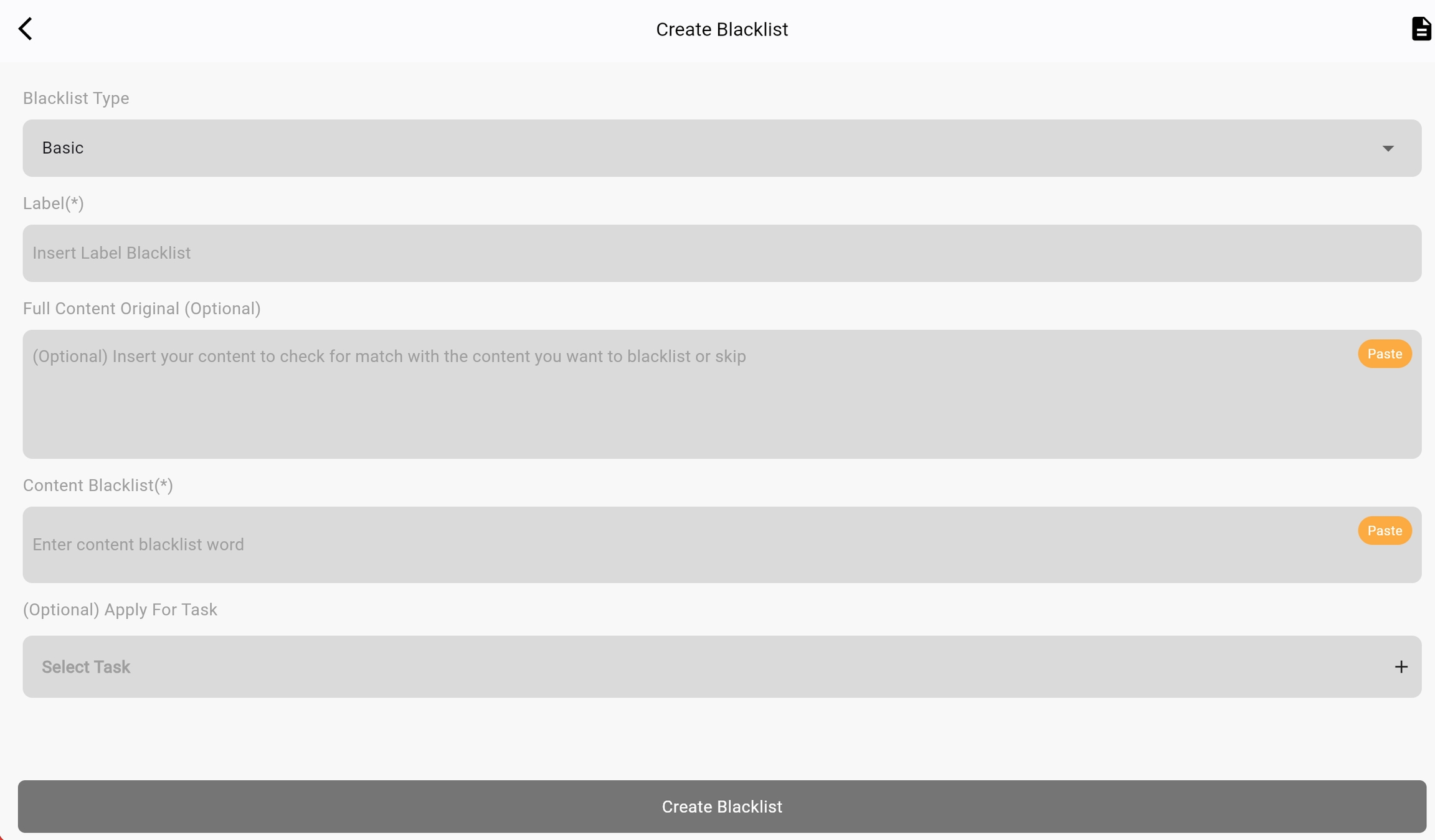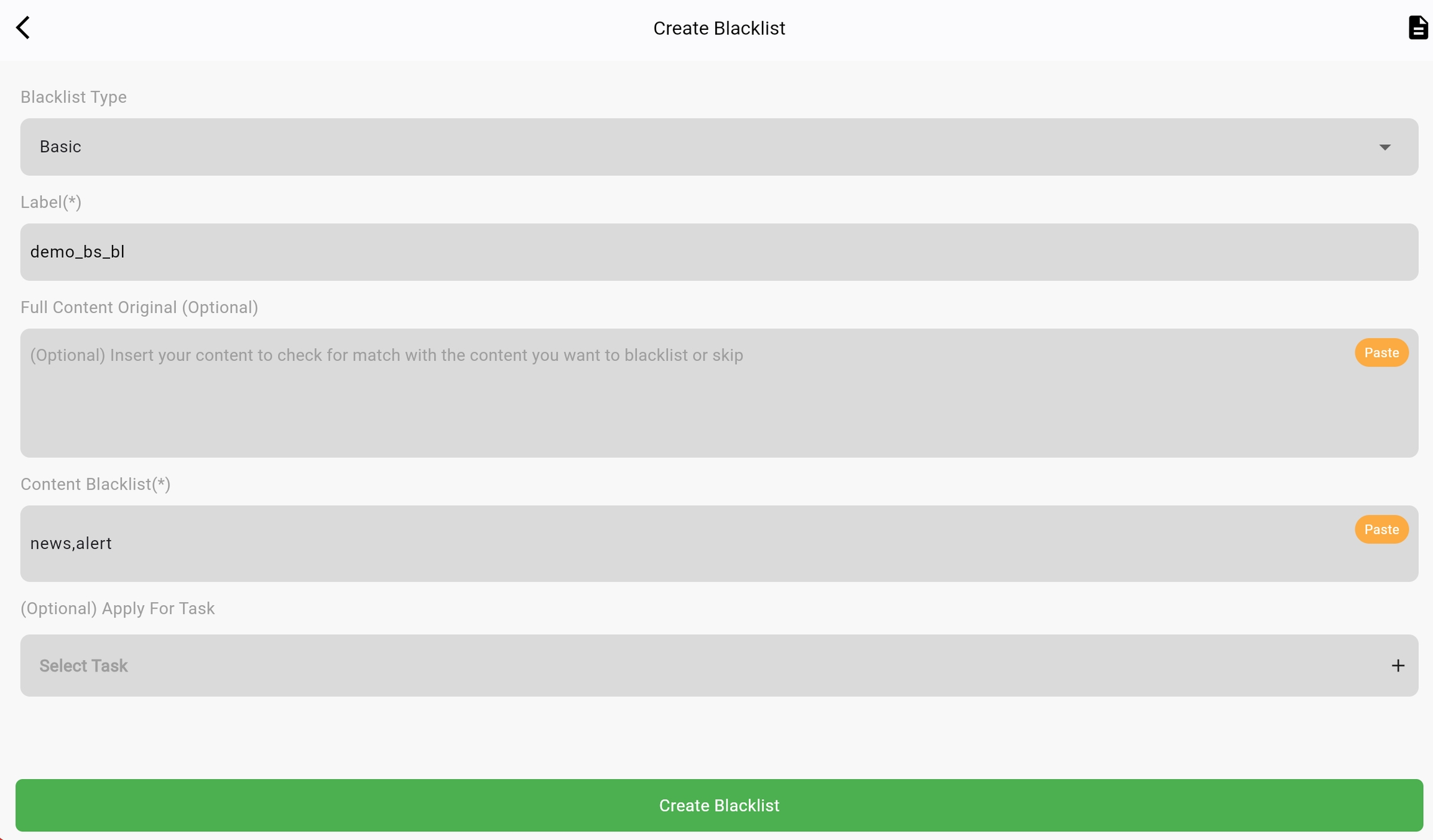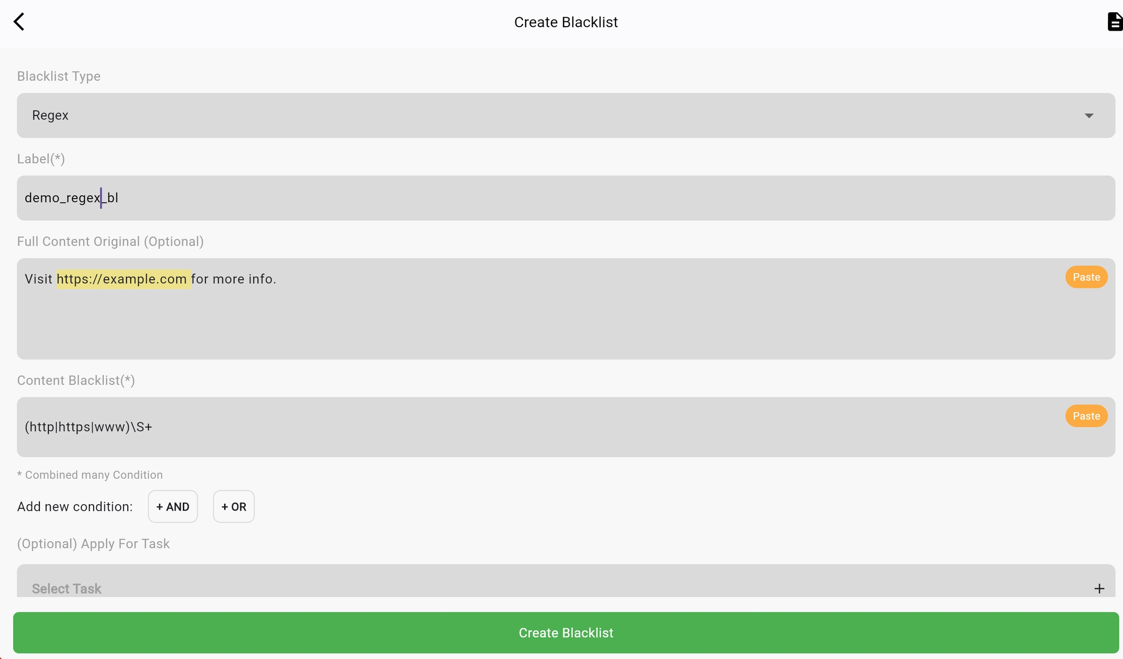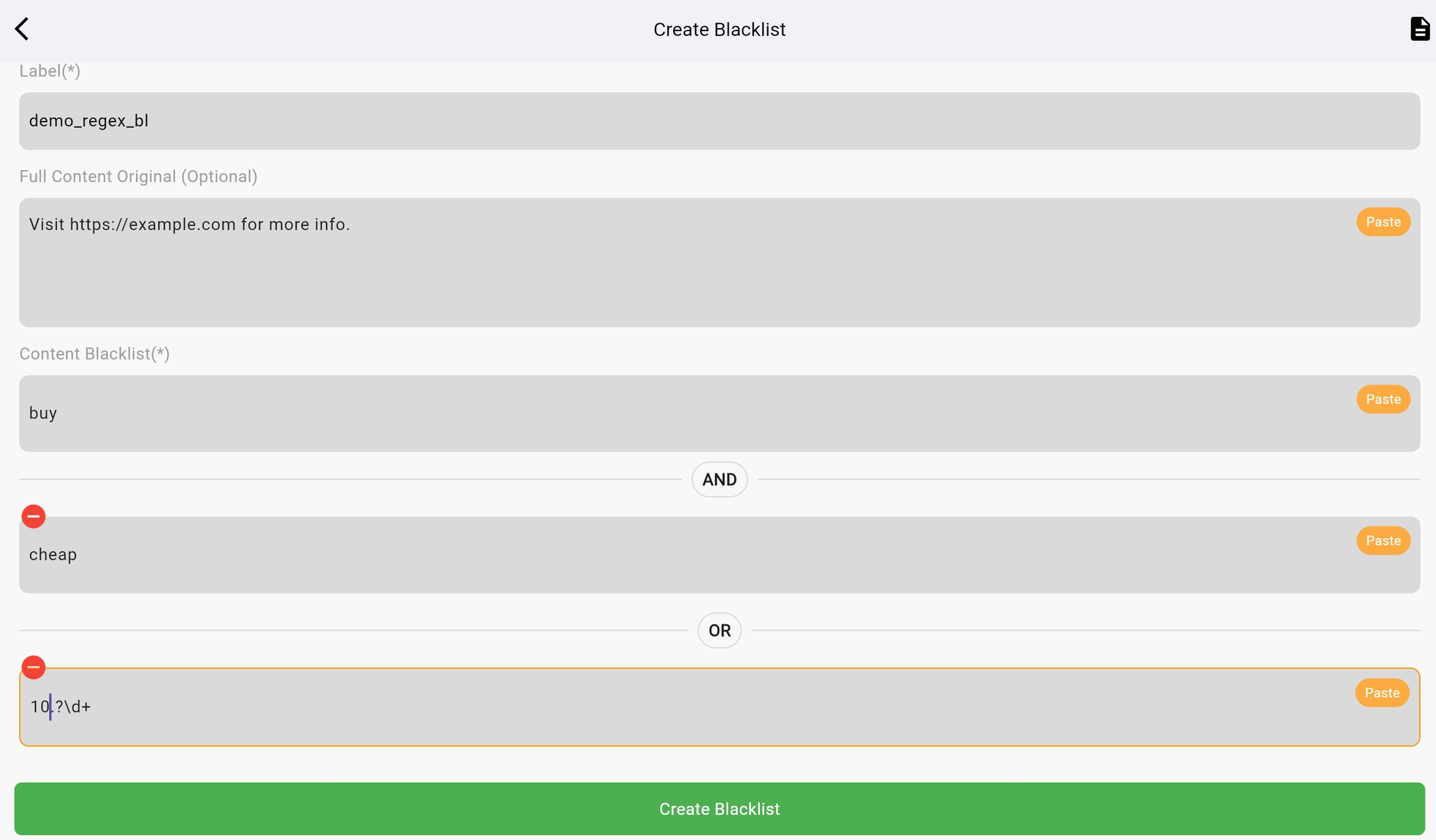 123456789) or the Username (e.g.,@blocked_user).Tap Create Blacklist to save the rule.