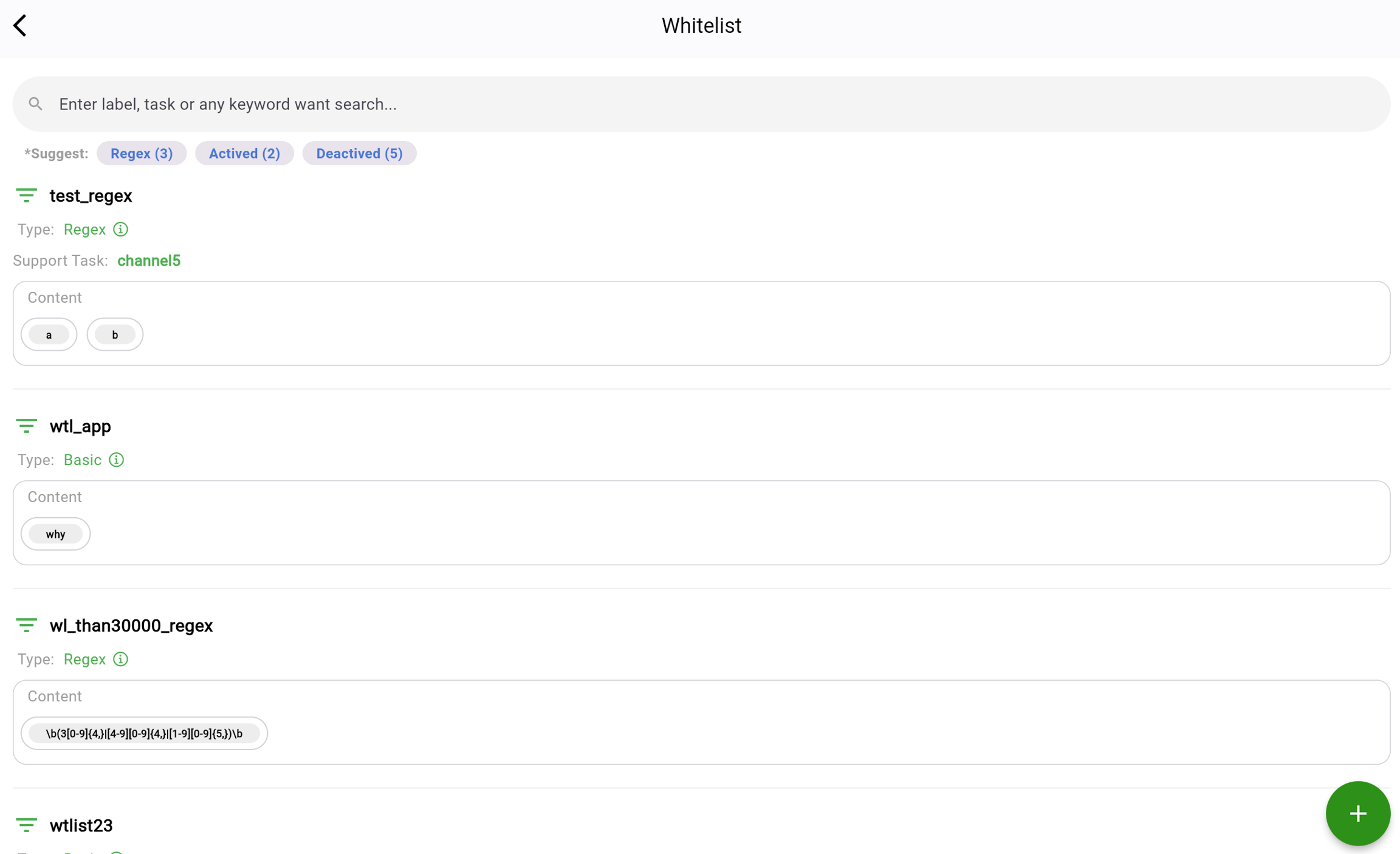 The Regex Whitelist is used for advanced matching. It allows you to use Regular Expressions to filter messages based on patterns.