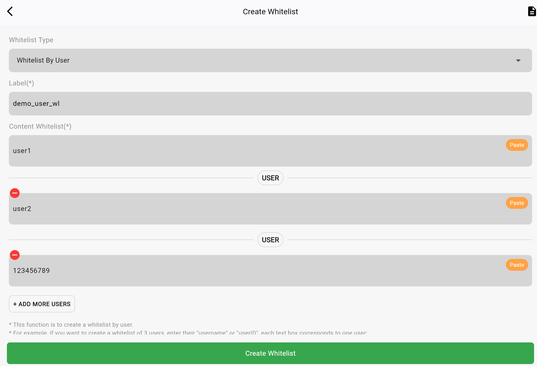 The Whitelist By User feature allows you to forward messages only from specific users, channels, or groups that you select. By using a Whitelist, you can specify which users' messages should be forwarded using their USER_ID or USERNAME.