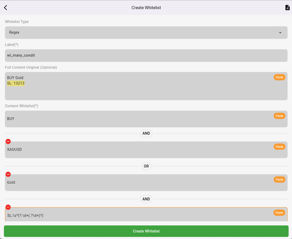 Result: The message must include both "BUY" and "SL: 13213" to pass the filter.