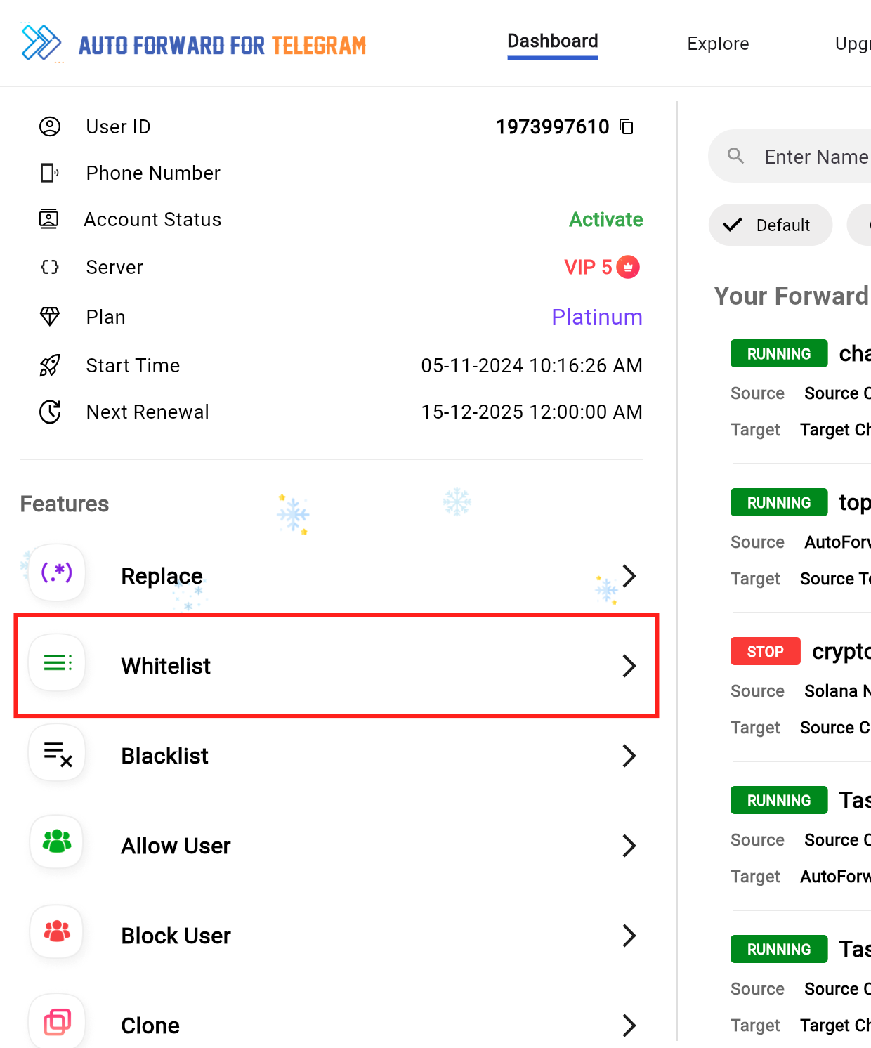 The Whitelist feature allows you to define a list of approved users, groups, or channels whose messages will be forwarded. This ensures that only content from specific sources is included in the forwarding process, helping you filter and control message flow effectively.